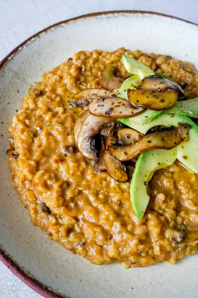 Știu că sună atipic, dar trebuie să mă crezi că este ceva foarte delicios. Gustul este puțin acrișor, sărat de la miso… stai și te întrebi dacă într-adevăr sunt fulgi de ovăz sau este orez. L-aș numi preparat surpriză. Seamănă mult cu un risotto cremos cu ciuperci. Foarte rapid și ușor de făcut, pentru un mic-dejun savuros.