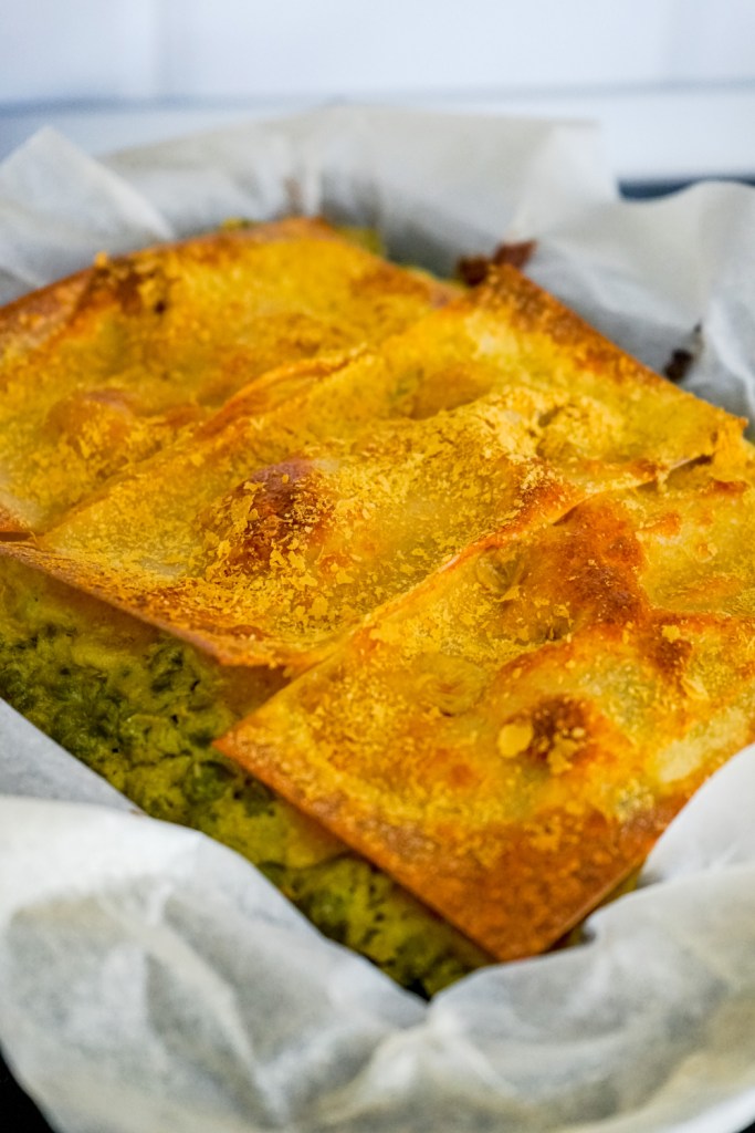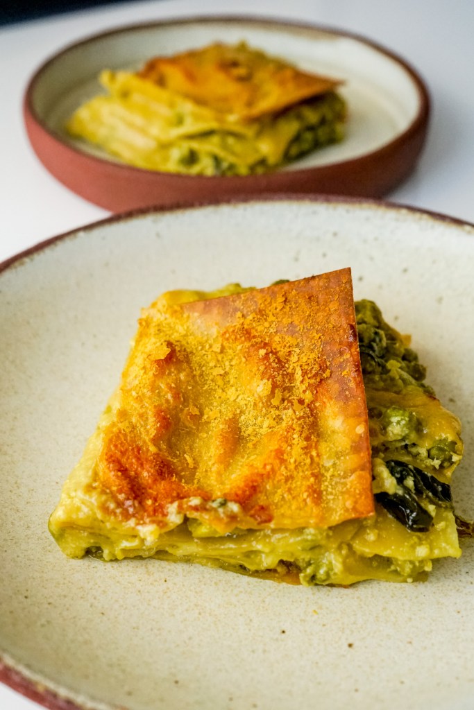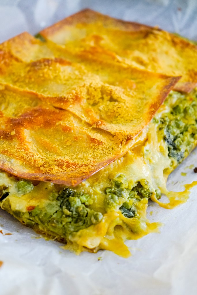 Ne place această lasagna cu pesto, exclusiv pe bază de plante, deoarece combină ingrediente simple și proaspete pentru a crea o capodoperă a aromelor. Sosul alb, neted și cremos, se așează perfect deasupra pesto-ului verde gros, printre foile de lasagna. Deasupra este un strat considerabil de drojdie nutritivă, care îi conferă acea aparență aurie, crocantă după coacere.